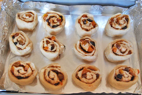 Stick them in a greased baking pan, cover them, and let them rise for about an hour in a warm place until they are doubled in size. I forgot to take a picture of them after rising, but they basically rise until they fill the whole pan.