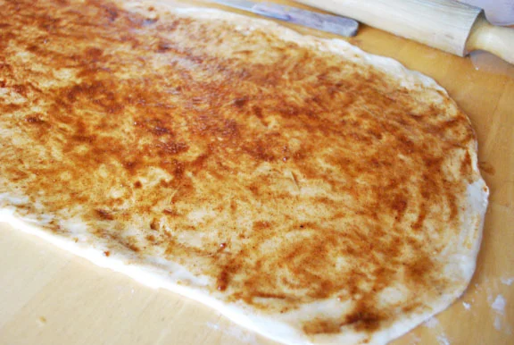 - Mix together the brown sugar and cinnamon and spread it over the dough.