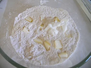 Mix together your dry ingredients, add the butter, then use your hands to incorporate your butter. This photo was from the biscuit post, but the process is similar. You could use a pastry cutter or a fork to do this, but hands are just so much faster.
