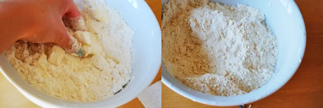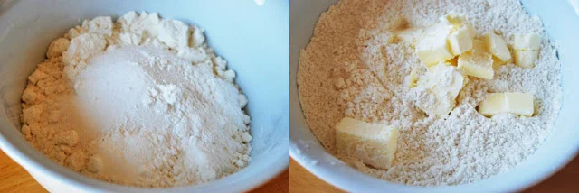 Mix your flour salt, sugar, baking powder with a wisk. Then add your cubed butter, and work it into the flour with your hands. Or use one of those fancy pastry cutters. Don't worry if there's a few chunks.