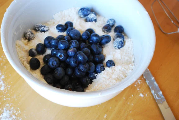 - Whisk together flour, granulated sugar, baking powder, and salt in a large bowl. Cut in butter with a pastry cutter, or rub in with your fingers, until mixture has the texture of coarse meal. Stir in blueberries.