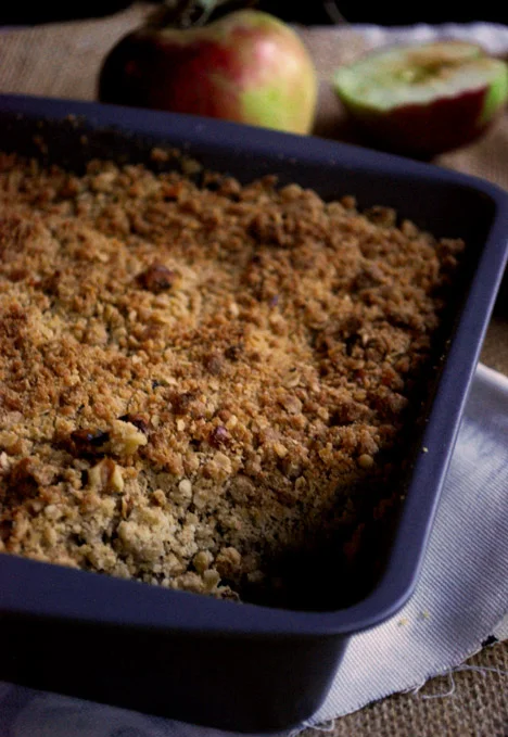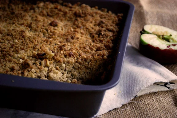 Then place the apples in a greased baking pan, top with the streusel, and pop it into the oven. Bake for 20-25 minutes, until the topping is golden brown. And that's it!