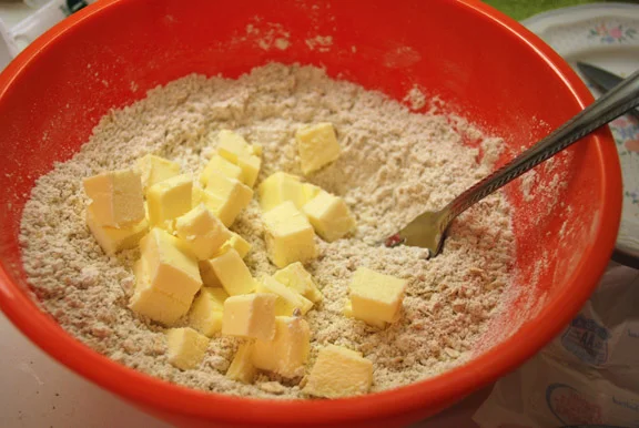 - Add the butter and rub it into the flour using your hands or a pastry cutter. Mix in the pecans.