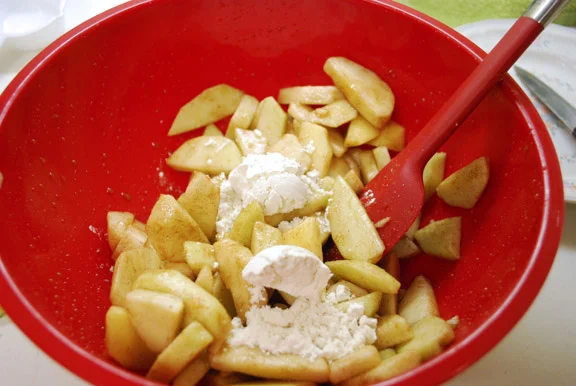 - Mix together the apples, ½ cup sugar, 2 tablespoons flour, and 1 teaspoon cinnamon. Set aside.