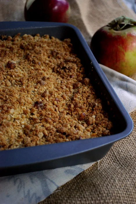 - Pour the apple mixture into a greased 8x8 baking pan or pie plate. Sprinkle streusel on top, and bake for 20-25 minutes, or until the topping is golden brown. Let cool and serve.