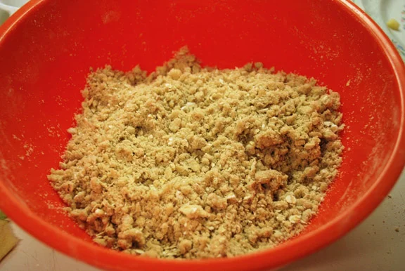 To make the streusel topping, mix together the flour, oats, sugar, salt, and cinnamon. Add the cubed butter and use your hands or a pastry cutter to work it into the flour.