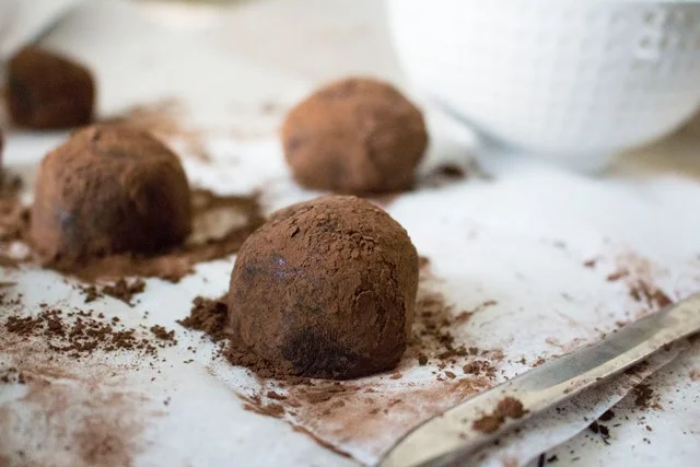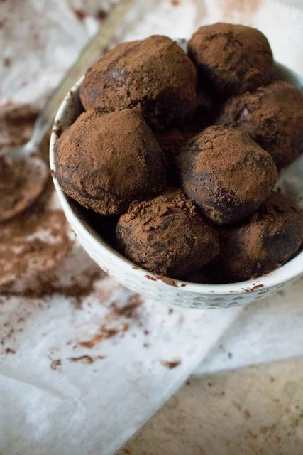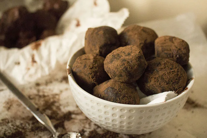 The next day, use a truffle scoop or hand-and-spoon method to shape the truffles. Chill in freezer for another couple hours, then prepare a bowl of cocoa powder and roll the truffles in it until completely coated. Chill again before serving, or enjoy right away.