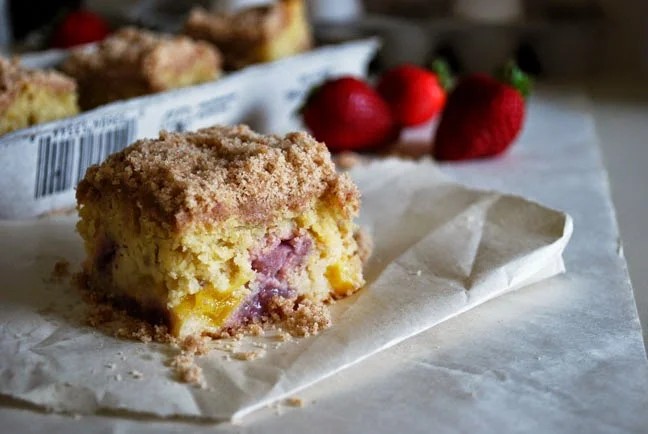 This coffee cake is a more sophisticated, less fake version of that crisp, playing off the same flavors of peach, strawberry, cinnamon, and cornflakes. It's about as easy, tastes way better, and is a great summer version of traditional coffee cake. The yogurt in this recipe gives the cake a nice dense crumb, and the cornmeal gives it a little more texture than normal coffee cake.